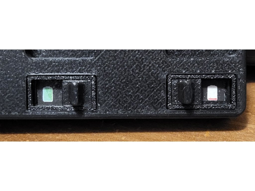 Součástí držáku je posuvný přepínač pro označení stavu baterií, abyste měli vždy přehled o jejich nabití.
