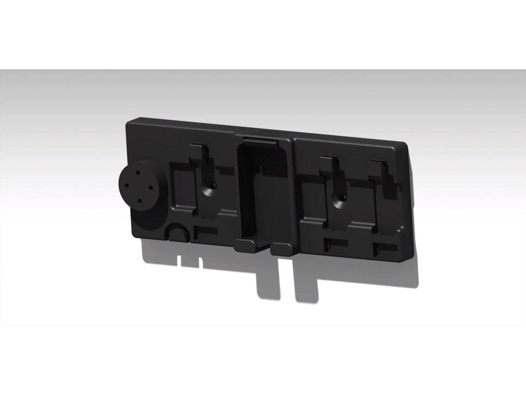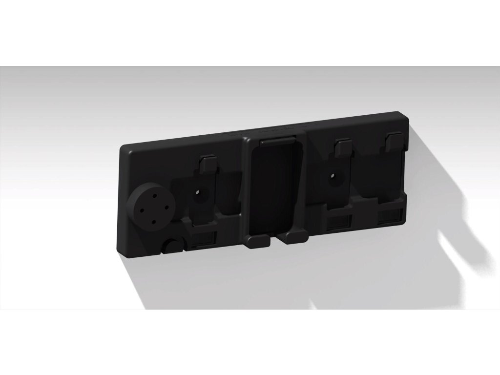 Držák je navržen tak, aby baterie i nabíječka zapadly do přesně tvarovaných slotů, které kopírují jejich tvar.