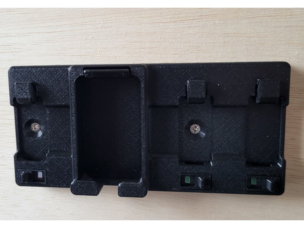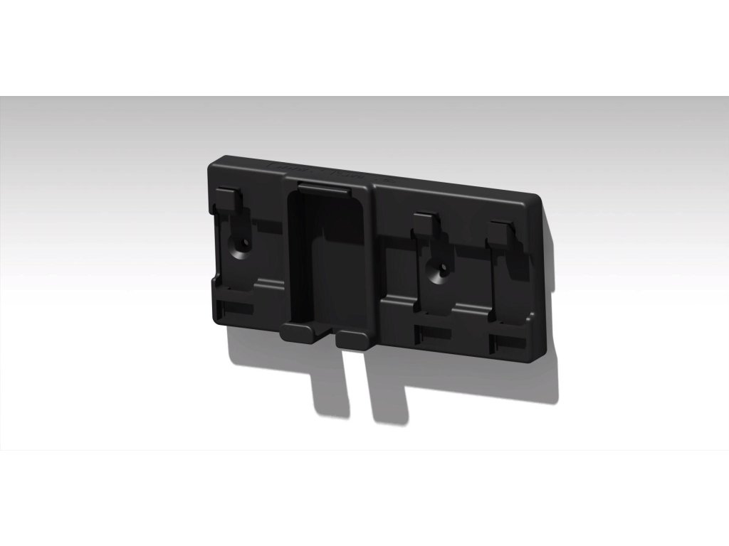 Držák je navržen tak, aby baterie i nabíječka zapadly do přesně tvarovaných slotů, které kopírují jejich tvar.